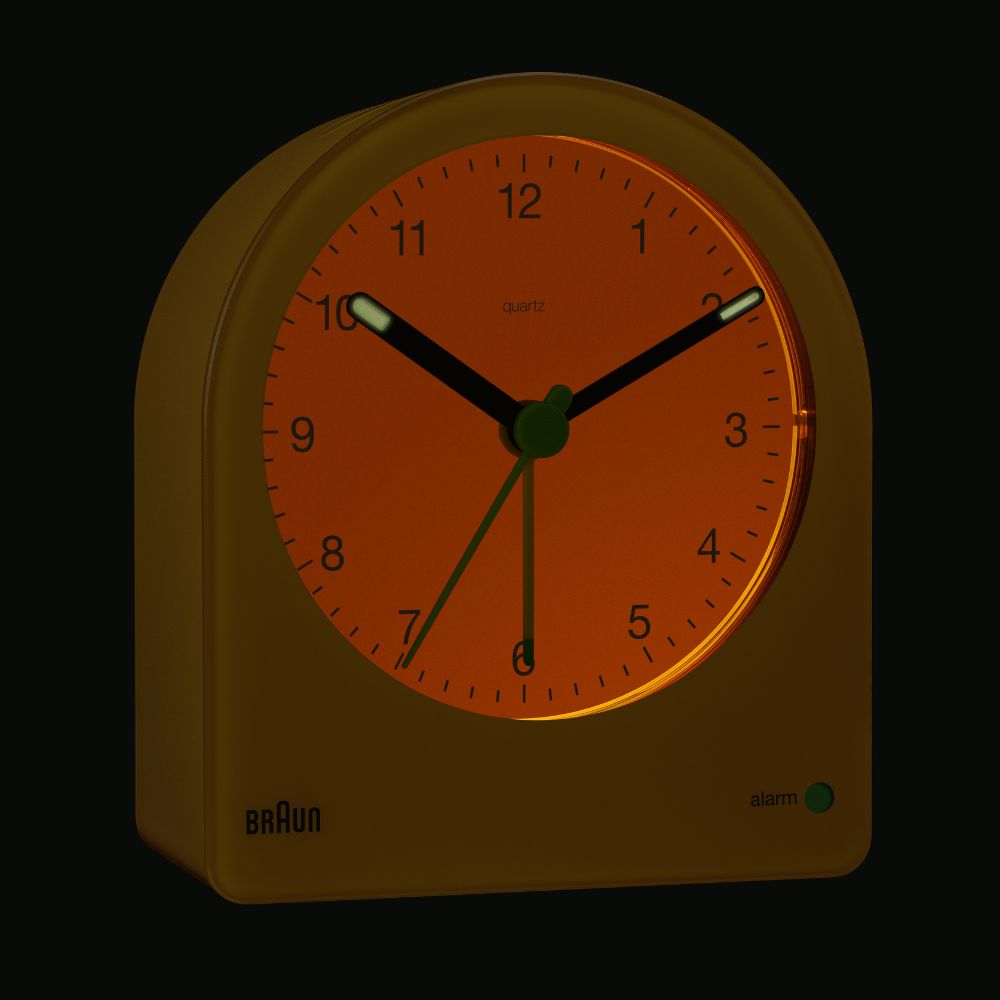 BC22クラシックアラームクロックの特徴的なフォルムは、1984年にディーター ラムスが 手掛けたAB2クロックをベースにデザインされ、そのすっきりとしたシンプルなダイヤルデザインと、先端が光る針のコントラストは優れた視認性を実現しています。